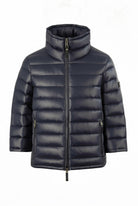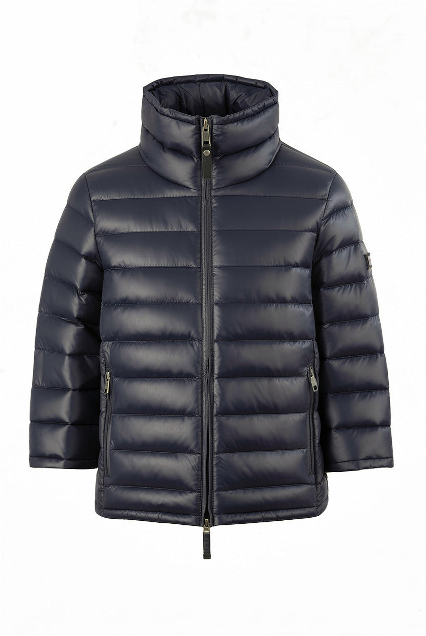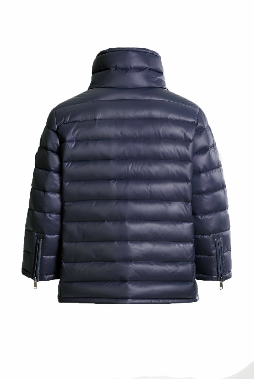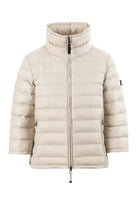 Celeste er en lett, kort dunjakke til dame med et moderne og sofistikert uttrykk. Den brede kragen og stoffets diskrete glans gir designet karakter, mens de korte ermene med glidelås tilfører en markert designdetalj.